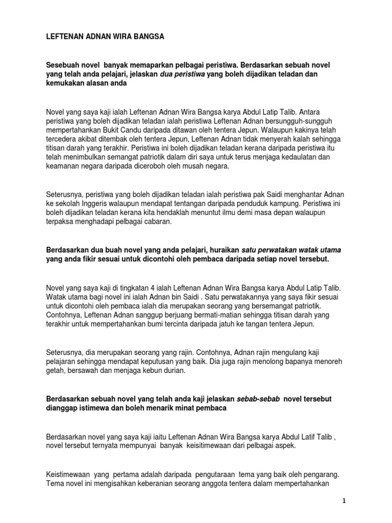 . Leftenan Adnan Wira Bangsa dimulakan dengan kisah Adnan yang masih kecil bersama keluarganyaPak Saidi berasa amat gembira kerana dikurniakan. Sila betulkan jika terdapat kesalahan ejaan. Novel Leftenan Adnan Wira Bangsa karya Abdul Latip bin Talib merupakan komsas tingkatan 4.